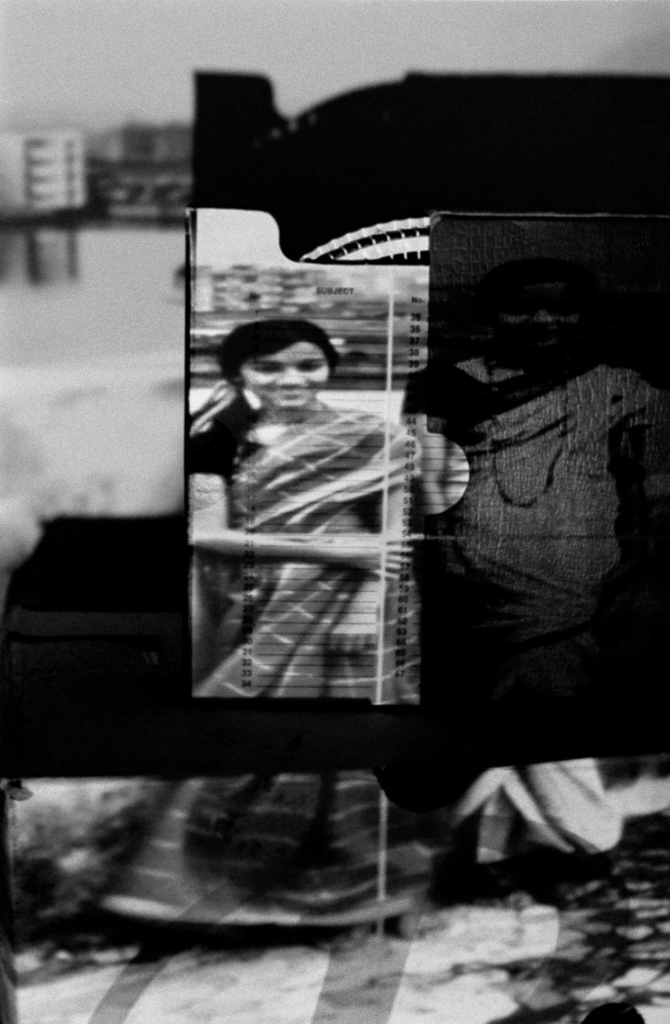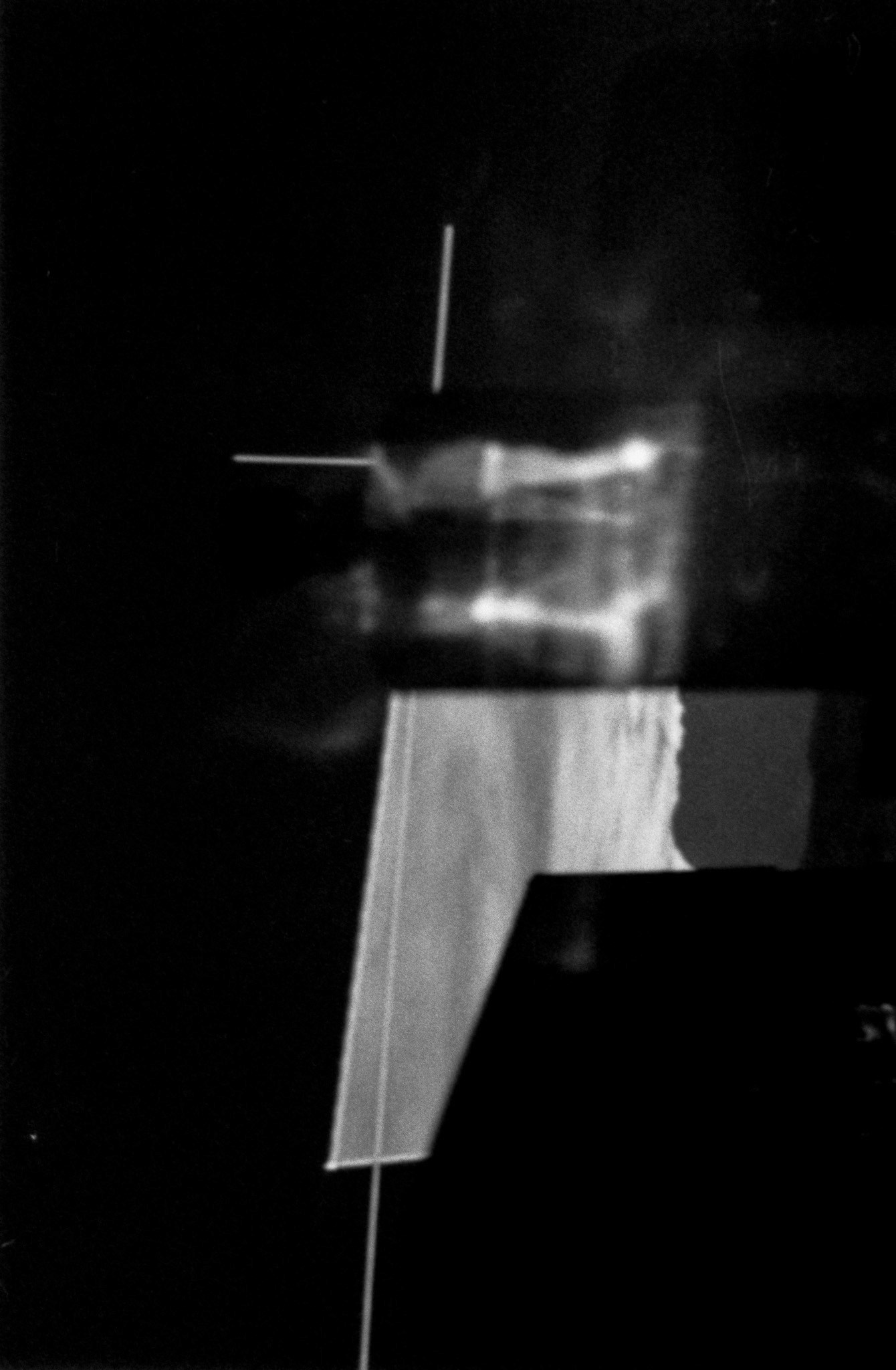 At least seven large-format transparency prints hang from the ceiling on invisible wires—each around five feet tall in a 3x2 aspect ratio. They hold images from the archive and images made from the archive: abstracted re-projected footage. Spotlights illuminate them from both front and back, with the light direction changing on a timer. As the lighting shifts, the transparencies transform. The images appear to breathe, never settling into a fixed presentation.