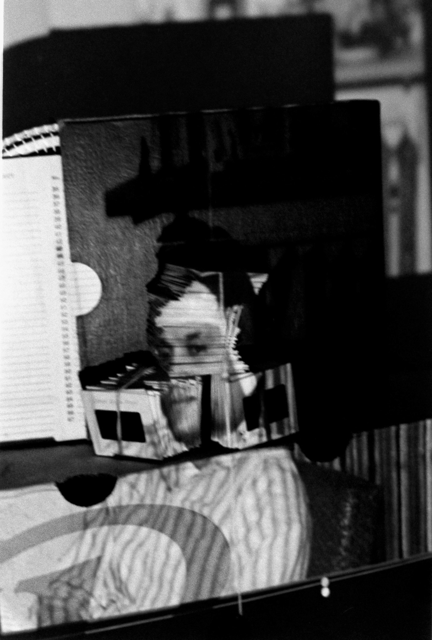 A projector displays Super 8 film from the archive, casting footage through the corridor and beyond—onto walls and floors outside the exhibition's boundaries. As visitors move past, their bodies interrupt the light. Fragments from different eras drift into partial alignment before separating again. The projection spills past containment.